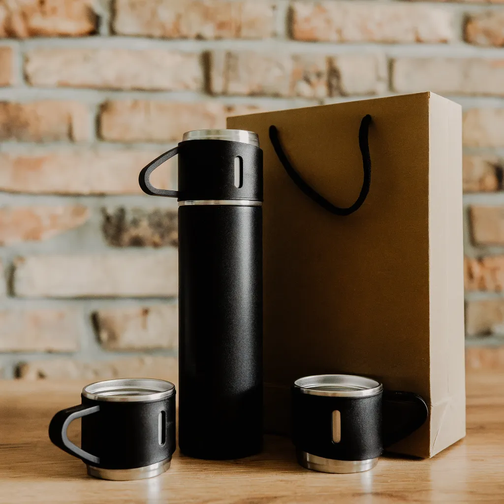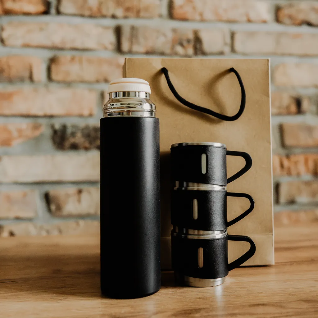 Zestaw termos 500 ml + 3 kubki 160 ml to idealne rozwiązanie dla osób, które cenią sobie wygodę i funkcjonalność. Jego matowa powierzchnia nie tylko wygląda elegancko, ale również jest łatwa do utrzymania w czystości. Zestaw zawiera 3 kubki o pojemność 160 ml oraz termos o pojemności 500 ml. Produkty posiadają podwójne ścianki ze stali nierdzewnej z próżnią miedzy ściankami co spowalnia oddawanie temperatury na zewnątrz. Zakrętka funkcjonująca jako kubek umożliwia wygodne i higieniczne dzielenie się napojem. Zestaw zapakowany w kartonik typu kraft. Termos trzyma ciepły napój nawet do 16 godzin. Praktyczny i gustowny zestaw na dalekie podróże w gronie przyjaciół i rodziny.